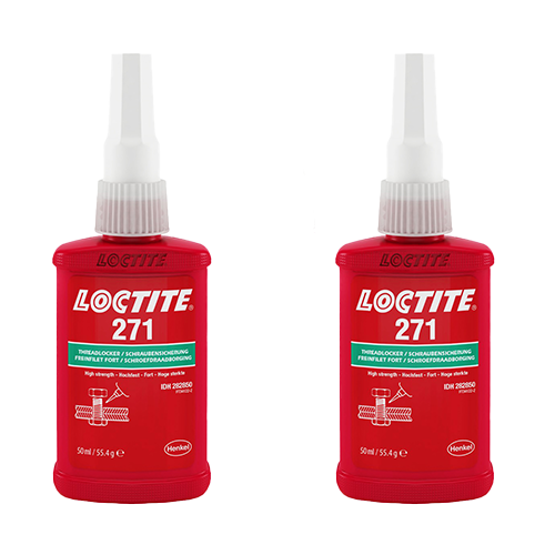 Loctite 271 is a high-strength red methacrylate-based threadlocking adhesive with a low viscosity. Steel fixtures take 10 minutes, brass 5 minutes, and stainless steel 15 minutes. Tolerates minor contamination from industrial oils. All metal fasteners are compatible.
