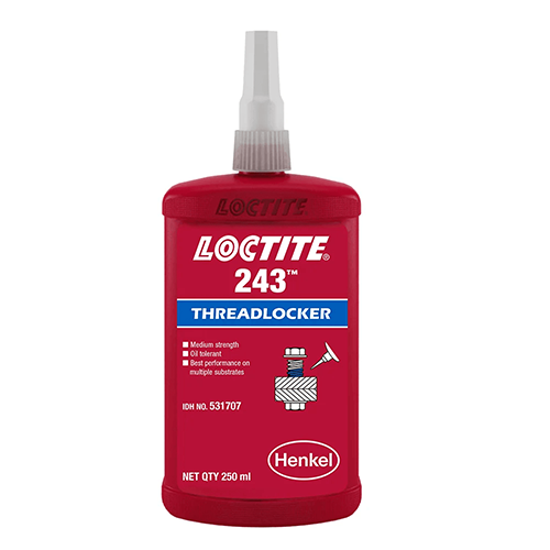 Loctite 243 (sometimes known as "Blue Loctite") is a medium strength threadlocker. It seals and locks metal nuts and bolts, preventing them from becoming loose due to shock and vibration. Loctite 243 bonds to all metals, including stainless steel and plated surfaces, which are less active. It performs well at high temperatures. It can withstand mild oil contamination from motor oils, cutting fluid, and anti-corrosion fluid.